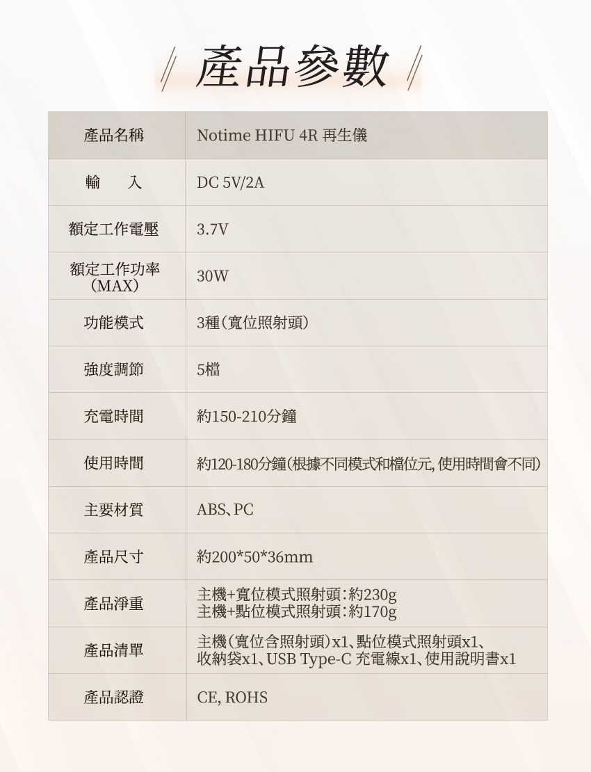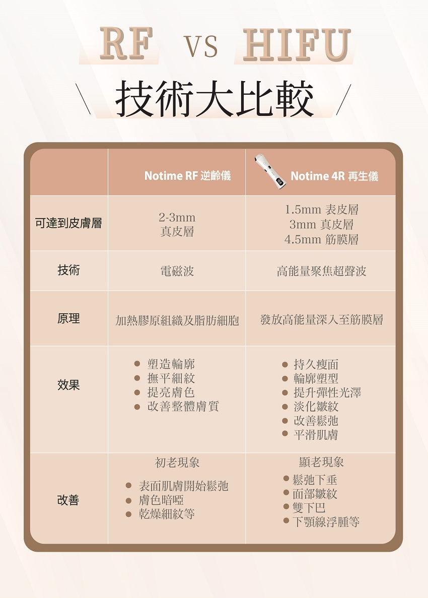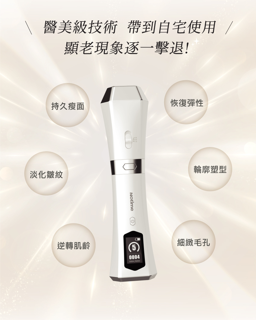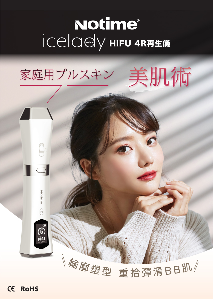 Notime HIFU 4R再生儀,採用高強度超聲波,直達肌膚深層,無創傷肌膚組織下瞬間提升到65℃至70℃,達致激活骨膠原再生,提供有效及持久瘦面、輪廓塑型、淡化皺紋、細緻毛孔、恢復肌膚彈性及光澤感等各種美容效果,就好似去咗美容院做咗拉皮埋線療程,初老現象逐一擊退!
