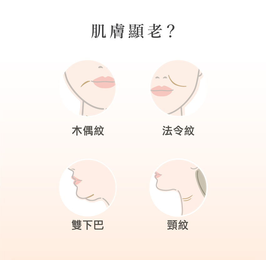 法令紋、木偶紋、眼紋、眼袋、雙下巴、頸紋等