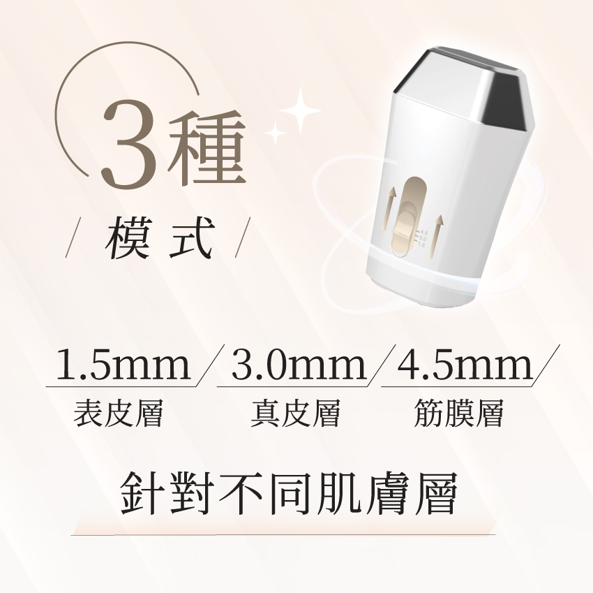 3.0mm :針對膠原層,刺激骨膠原增生,改善膚質、提升輪廓;