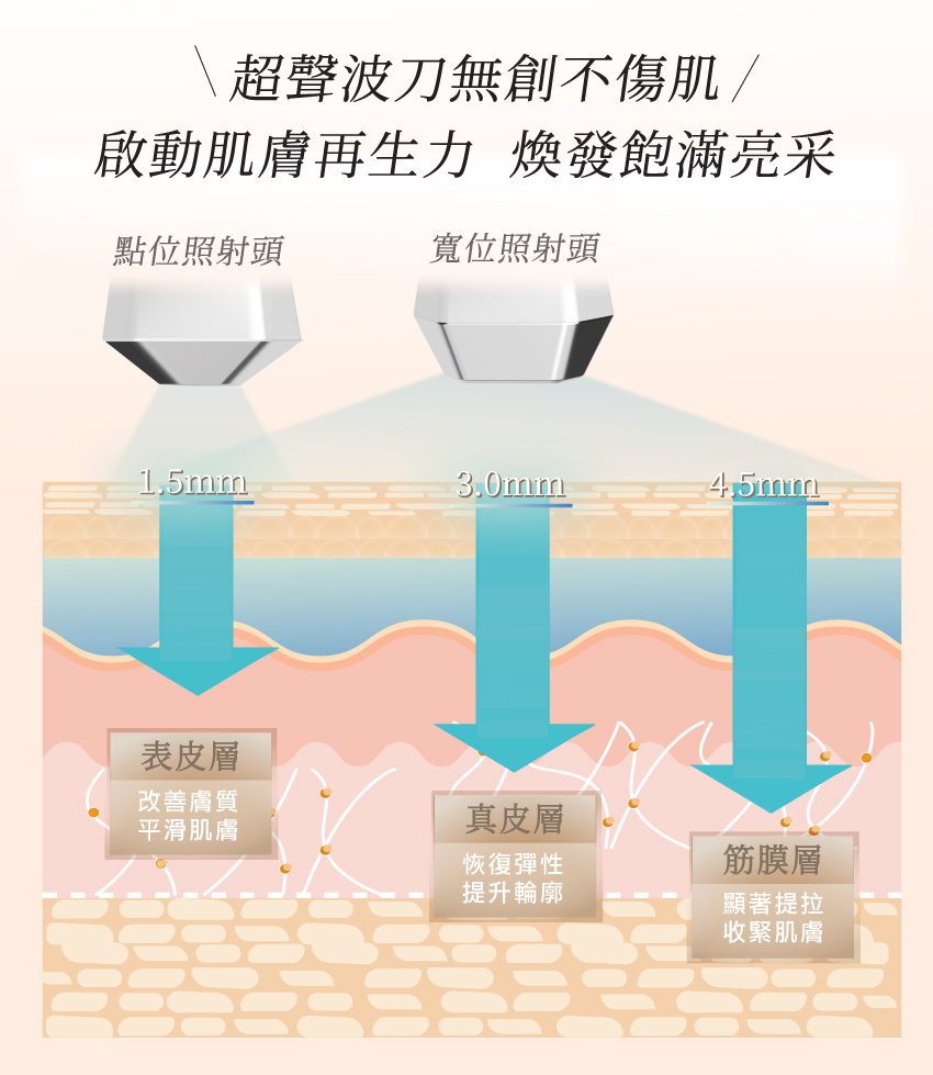 深入肌膚1.5mm表皮層、3mm膠原層及4.5mm筋膜層