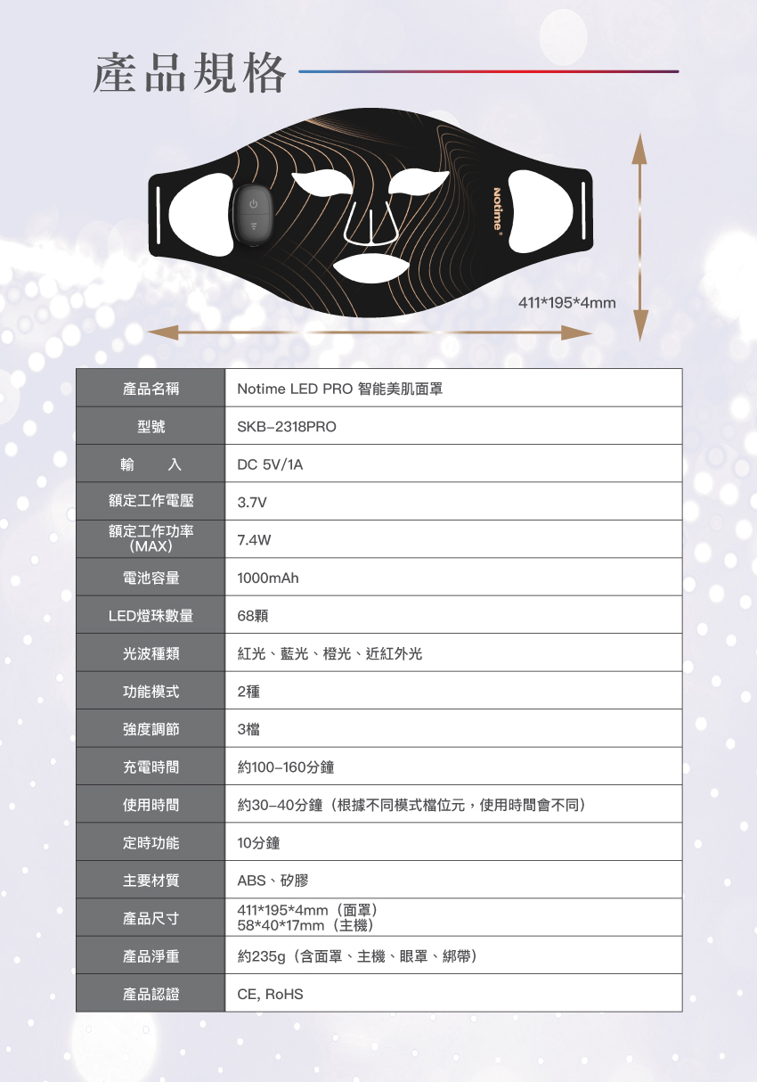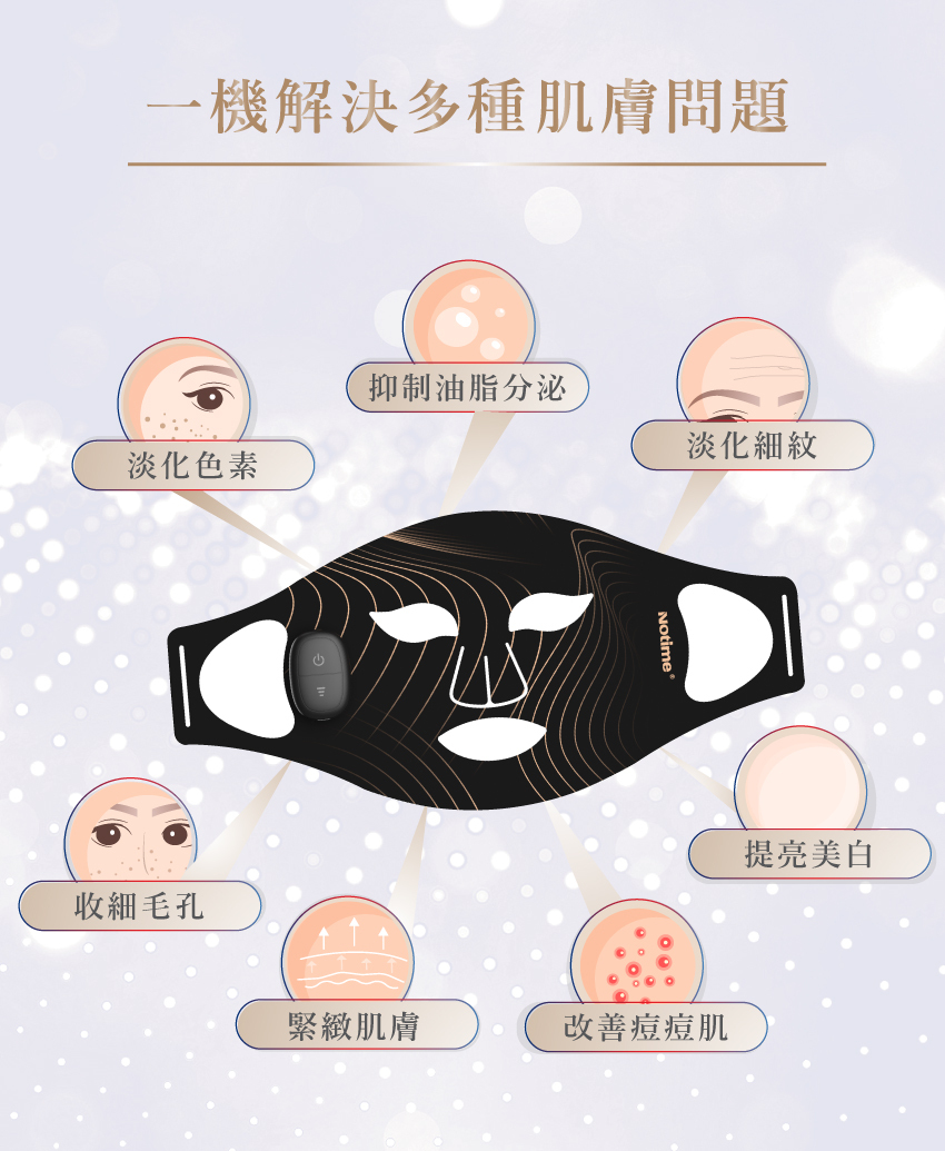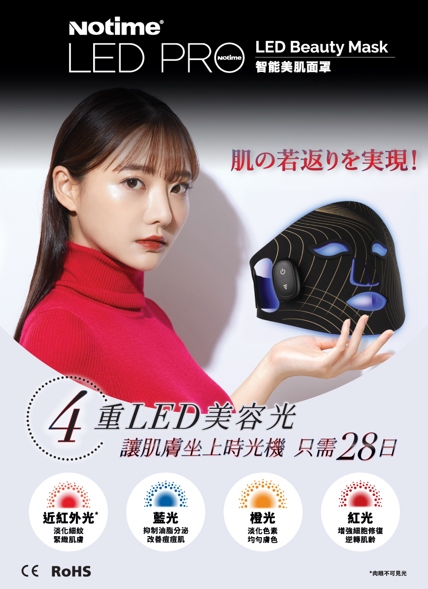 日本屢創佳績,Notime家用美容儀系列,最新推出Notime LED PRO智能美肌面罩,利用「LED美容光學」技術,一個Mask 擁有近紅外光、藍光、橙光、紅光4重光能,透過不同波長的特定光源,均勻地照射在肌膚之上,以達致紓緩炎症、刺激膠原蛋白增生、均勻提亮膚色等效果。