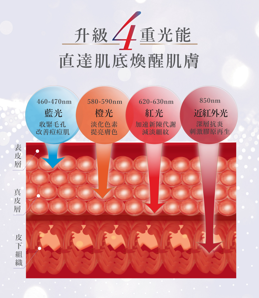 - 新式光學美容,4重光能直達肌底,煥醒肌膚