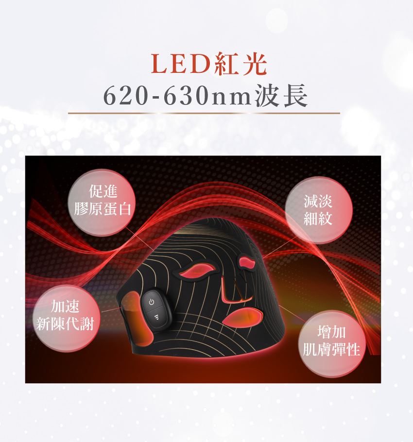 - 紅光 (620-630nm): 提升代謝,令肌膚更飽滿,逆轉肌齡