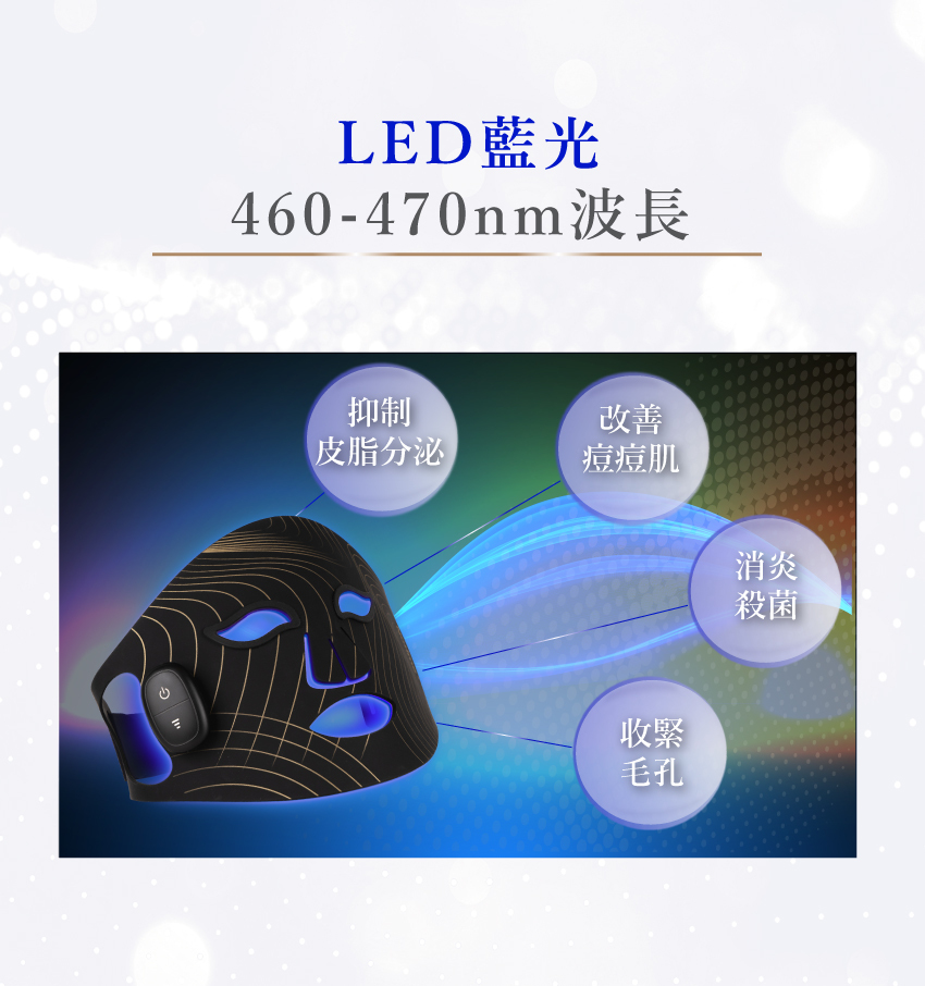 - 藍光 (460-470nm): 幫助抑制油脂分泌及細菌滋生,收緊毛孔,改善痘痘問題