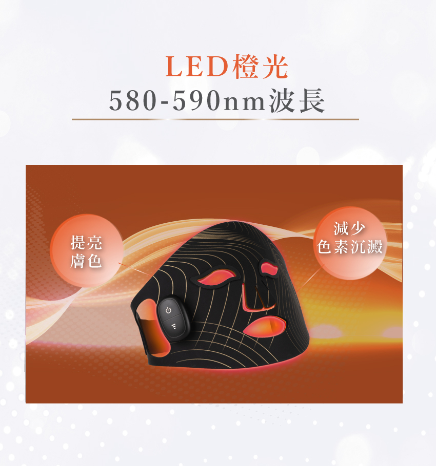 - 橙光 (580-590nm): 淡化色素,提亮美白,均勻膚色
