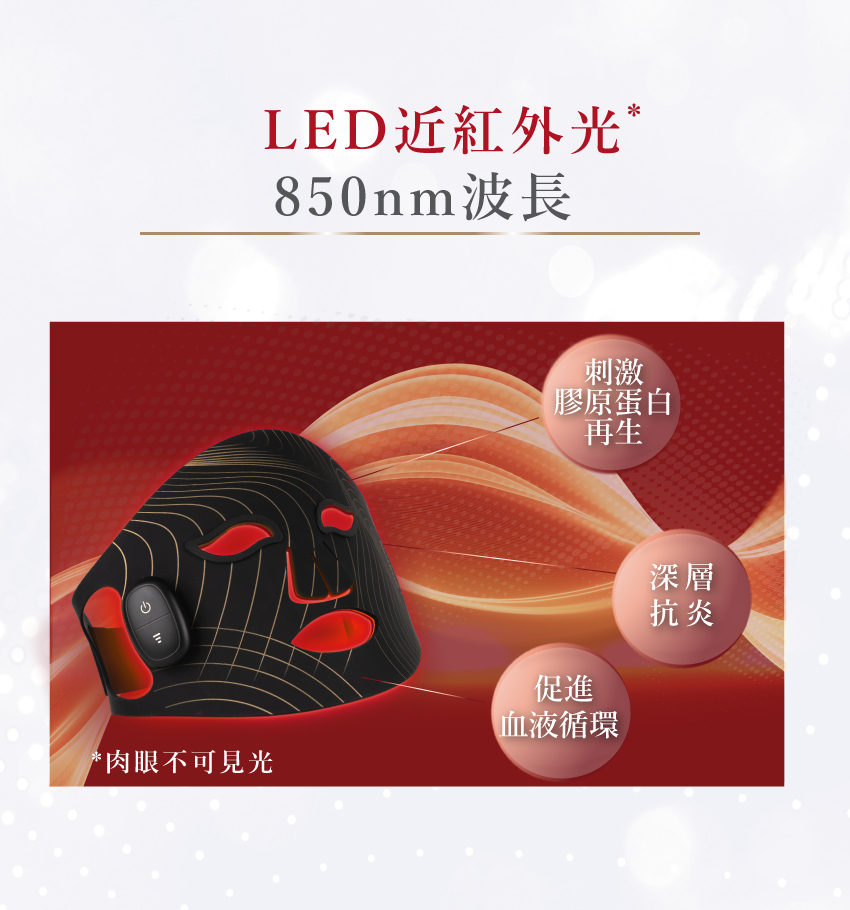 - 近紅外光(850nm): 深層抗炎,激活細胞及膠原蛋白再生,淡化細紋,緊緻肌膚