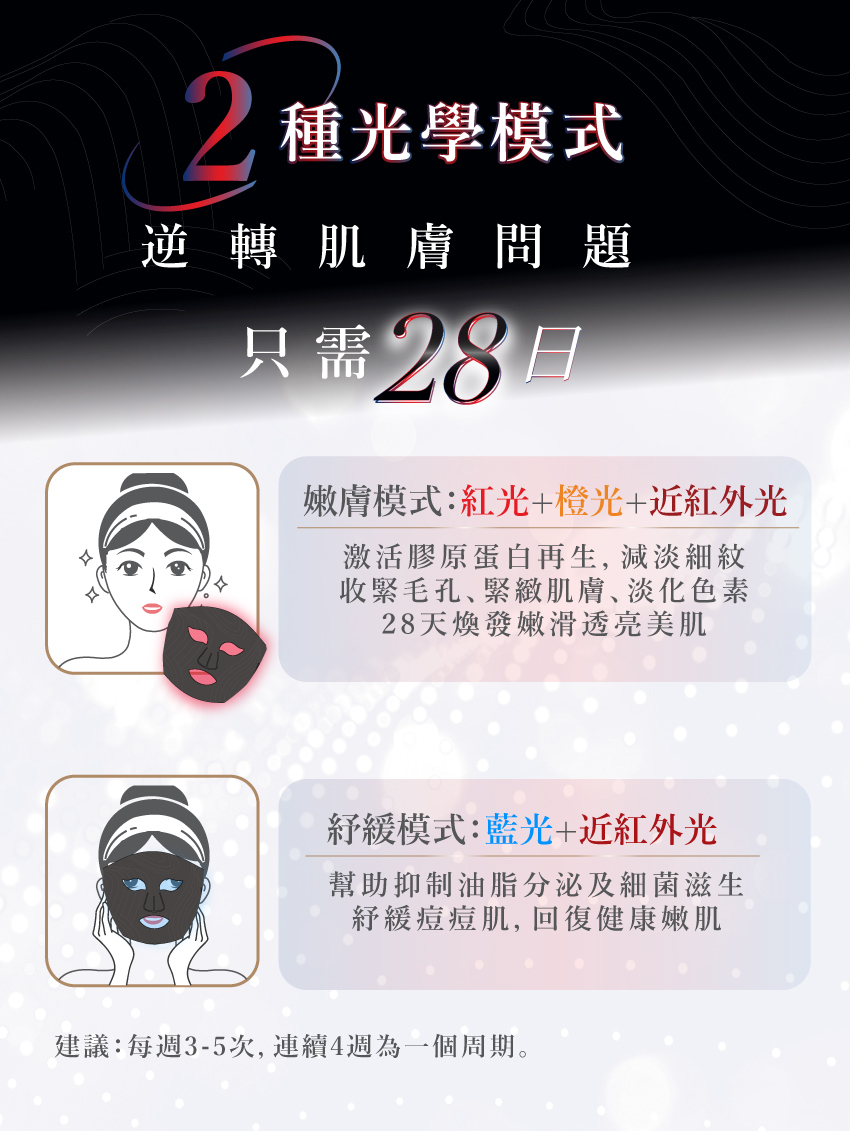 - 2種光學模式,逆轉肌膚問題,滿足玉顏舒緩、提亮、緊緻、嫩膚不同需要