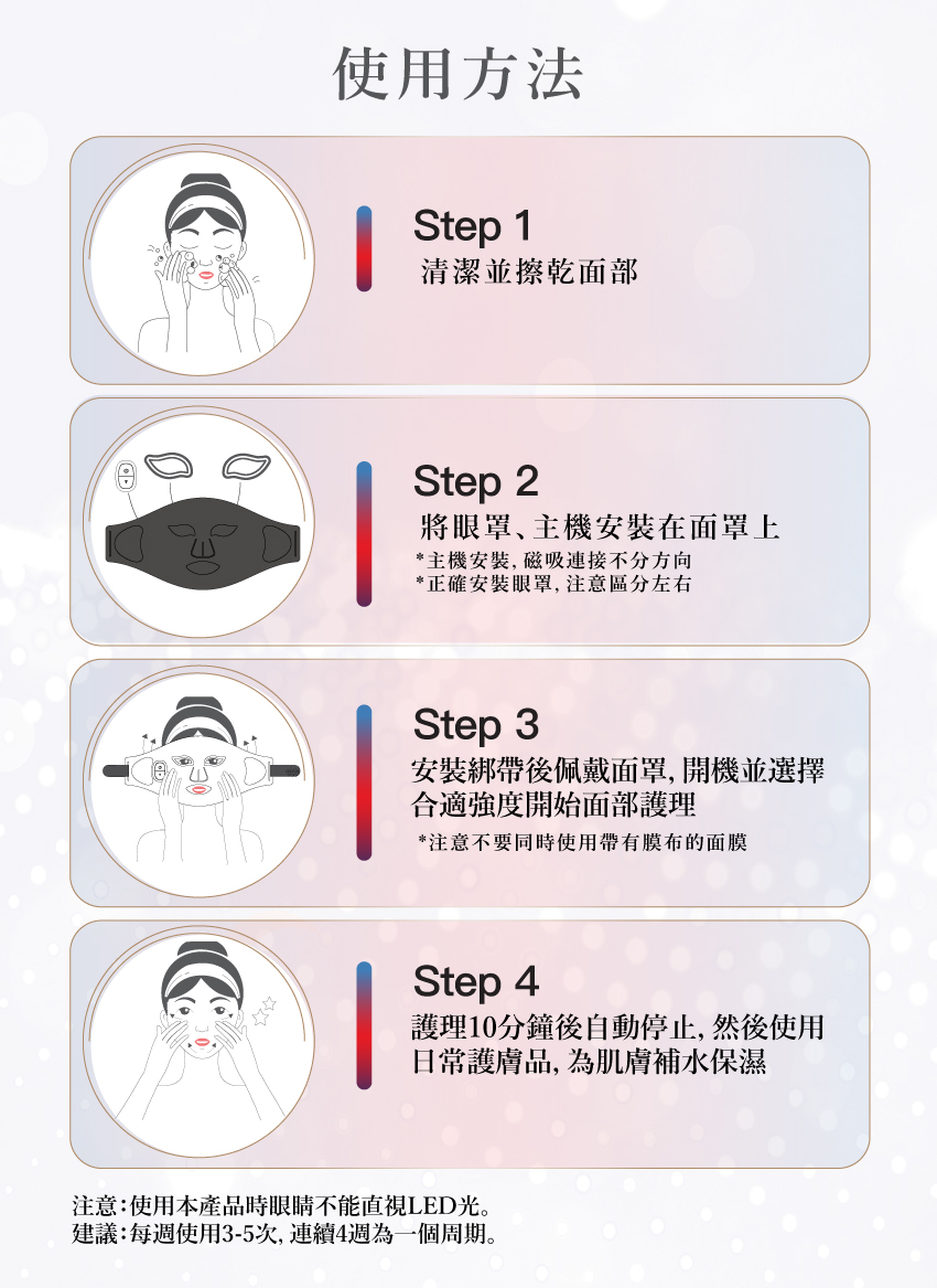 - 使用時,請勿在照射位置使用任何護膚品及避免照射眼睛。