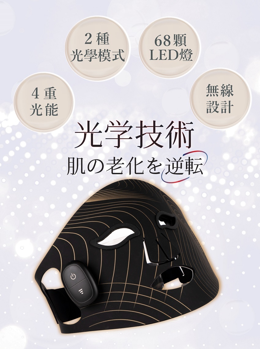 特別使用食品級矽膠,無線輕巧,配合68顆光學美容專用LED燈,貼合各種面型均勻密集受光,讓你自由享受美肌時光,煥發可見年輕美肌,只需28日,讓肌膚坐上時光機!